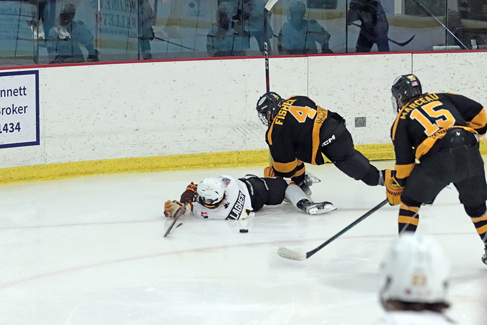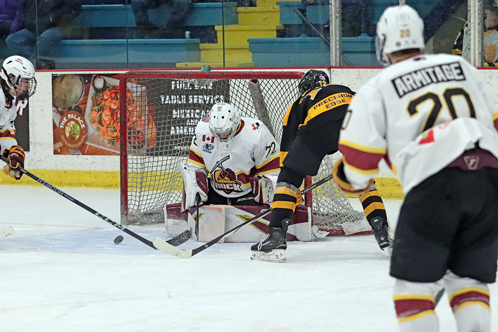 Coming back to level the proceedings half-way through the match-up, Sweitzer made a crisp pass over to Tyler Fortson, who drove into the Rock zone, then cut around a defender and flipped the puck over the blocker of Riley.