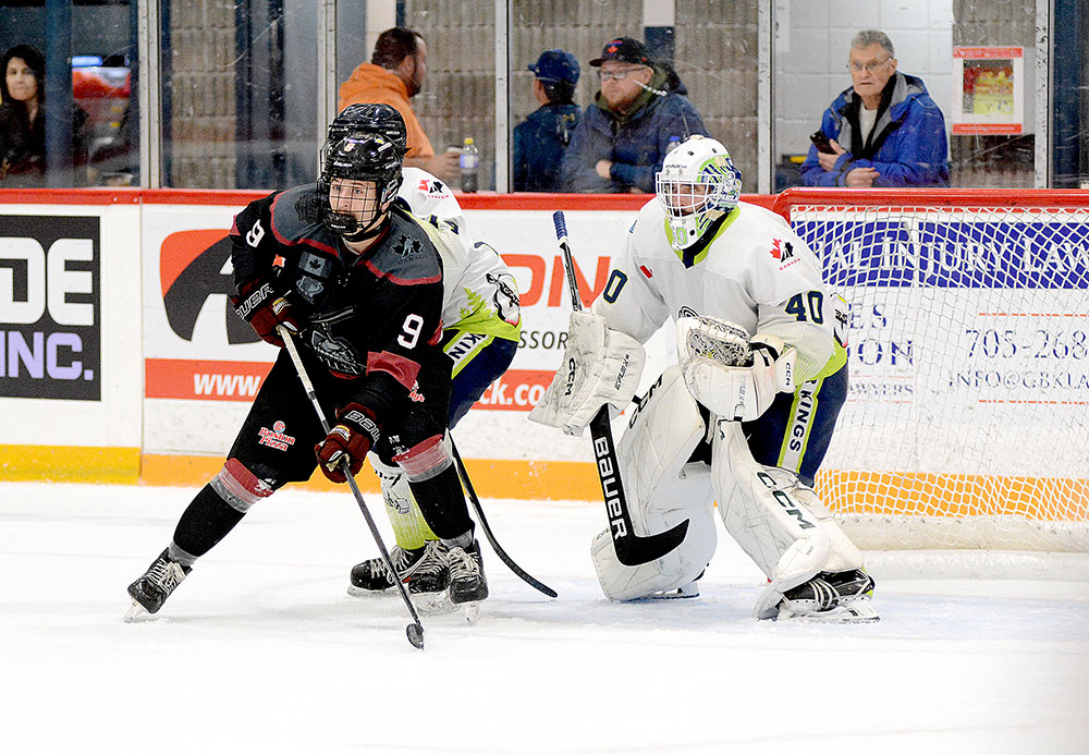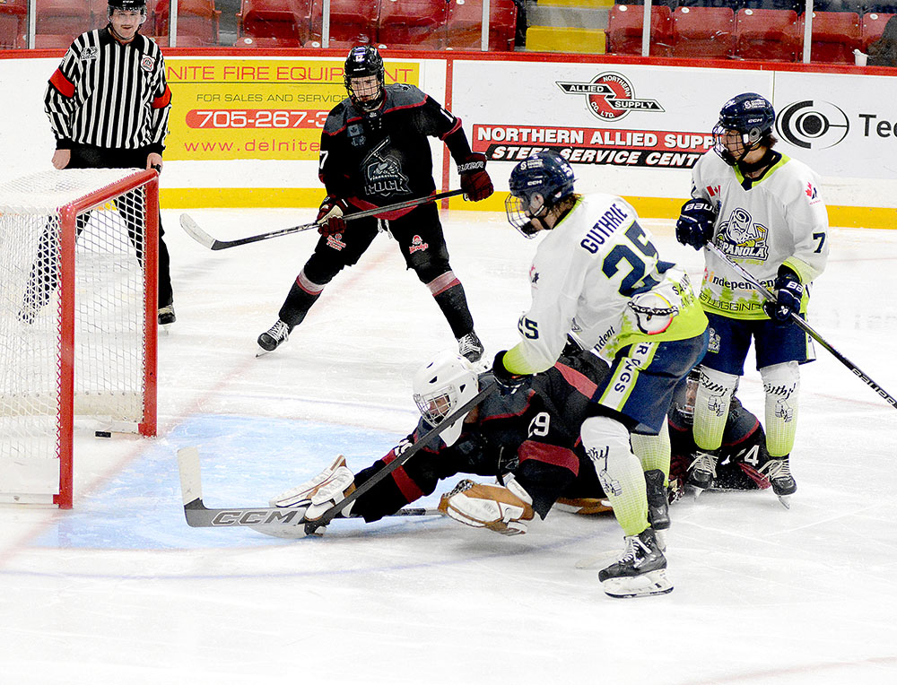 Heading to the third period, the guests added to their edge at 4:53 when Graydon Guthrie swiped the puck off a Timmins defender and went to the net where he made a crafty move in close, then cut to his left and slid in his fourth of the campaign.