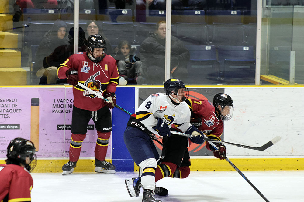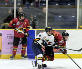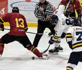 Going back in front while up a skater early in the third, Timmins’ captain Braedyn Cyr sent a shot to the target from the point that leaked through Coates and trickled in.