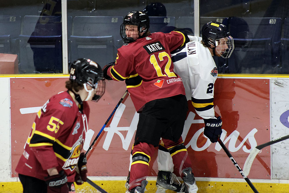 The visitors were quick to counter to regain the lead just over a minute later when Nolan Masson on an odd-man rush and kicked the puck up with his skate then wired one into the bottom left corner.