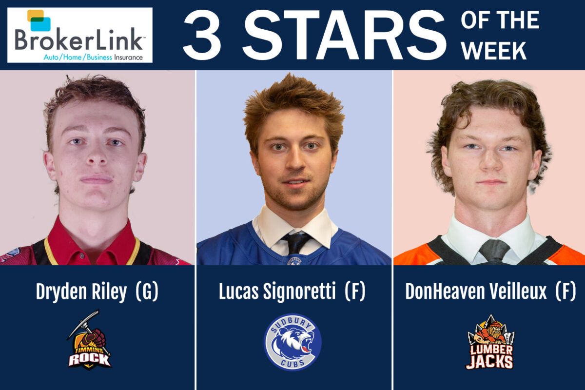 SUDBURY, Ont. – The Northern Ontario Junior Hockey League (NOJHL) announced Monday that goaltender Dryden Riley (Timmins Rock), along with forwards Lucas Signoretti (Greater Sudbury Cubs) and DonHeaven Veilleux (Hearst Lumberjacks) have been named its initial 2025 playoffs BrokerLink Insurance 3 Stars of the Week, for the period ending March 23.