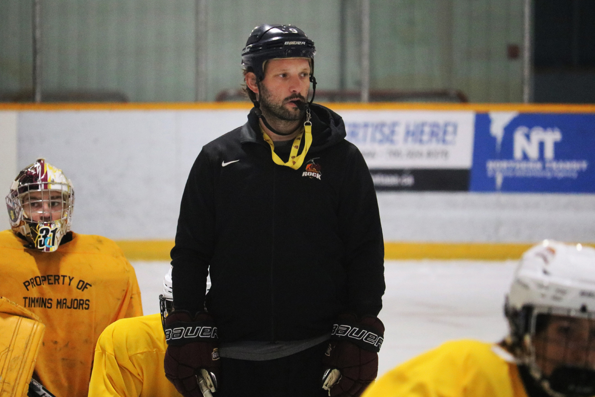 Timmins Rock head coach and general manager Brandon Perry observes his team’s practice on Tuesday afternoon at the Whitney Arena, as the team rounds into form during the second week of training camp Photo by Andrew Autio for The Daily Press